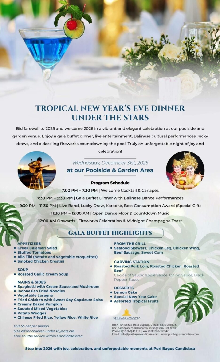 Set as an elegant tropical celebration under the night sky, the evening features Balinese cultural performances, a live band, a lucky draw, karaoke, an open dance floor, the official countdown, fireworks, and a midnight champagne toast at our Poolside & Garden Area. This is not just dinner — it’s a full celebration designed to say goodbye to 2025 and welcome 2026 in true East Bali style.