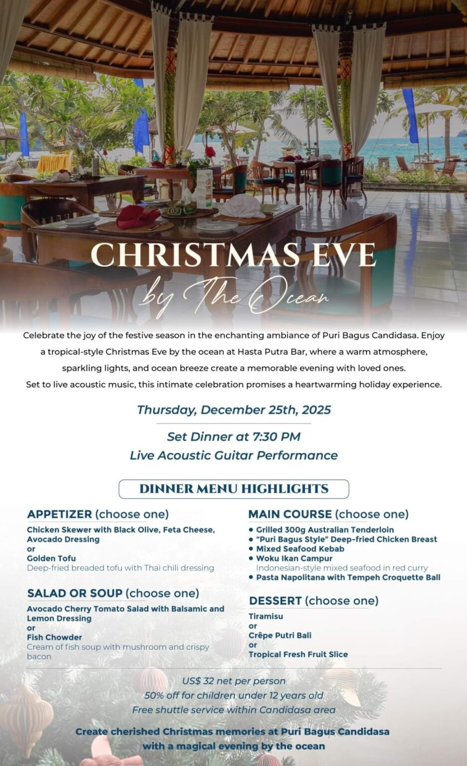 Spend Christmas Eve in a tropical, open-air setting by the sea at Hasta Putra Bar. Sparkling lights, ocean breeze, Balinese hospitality, and relaxed acoustic music create a romantic and intimate holiday mood. Service from 7:30 PM on 25 December.