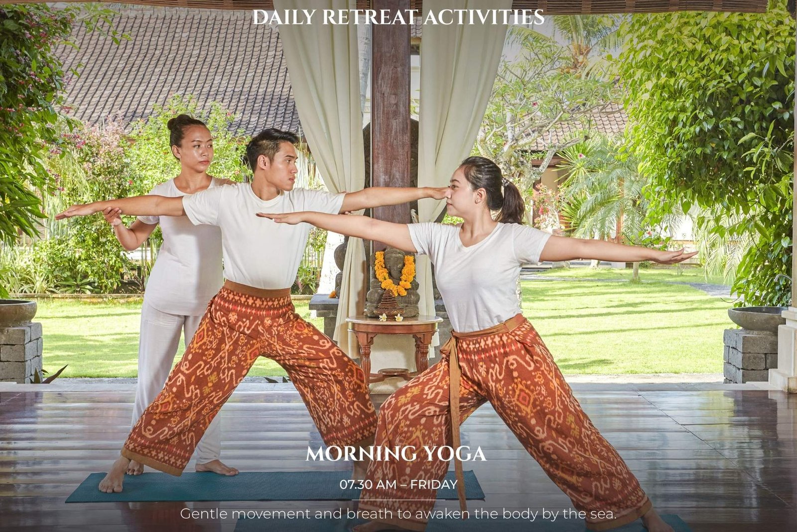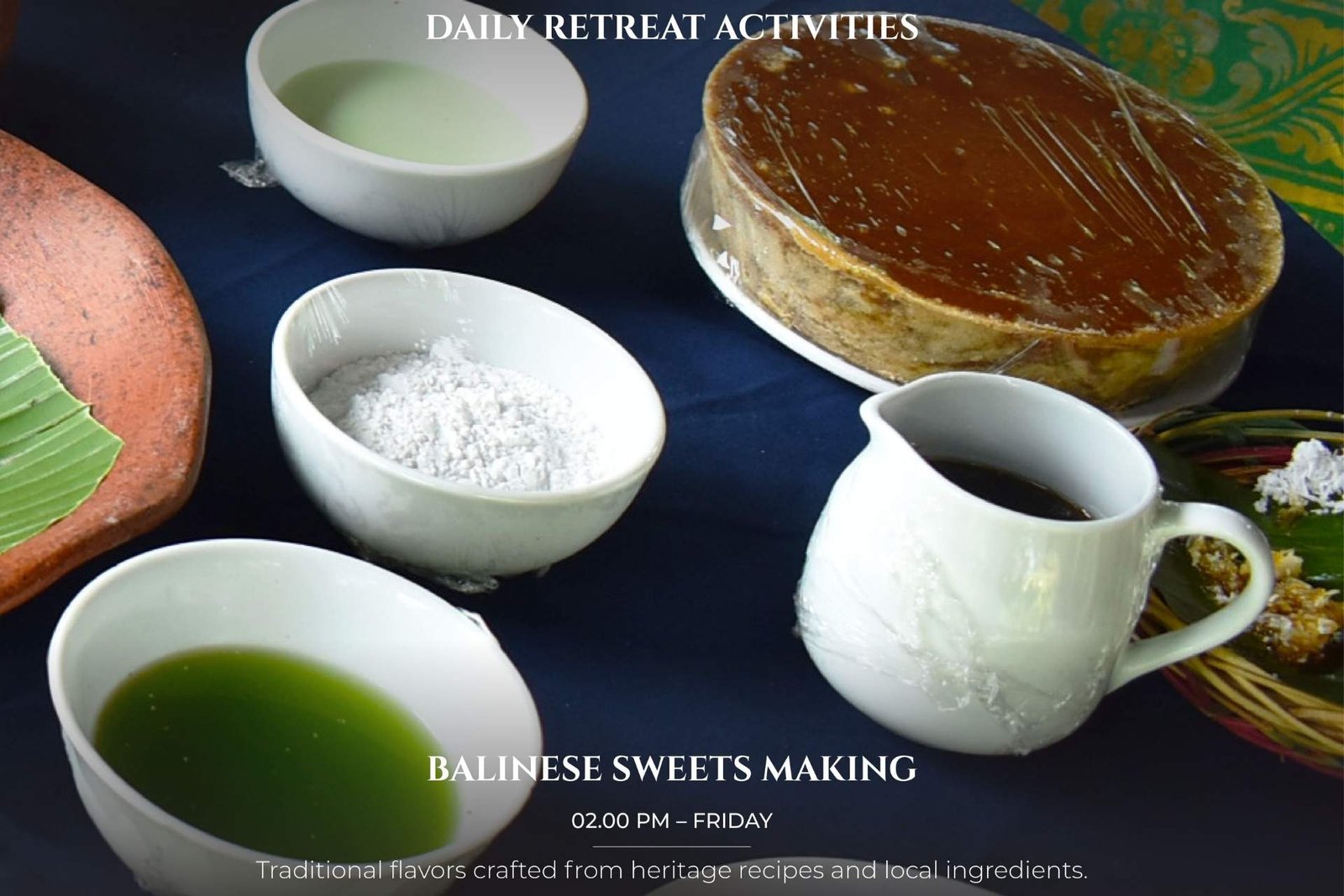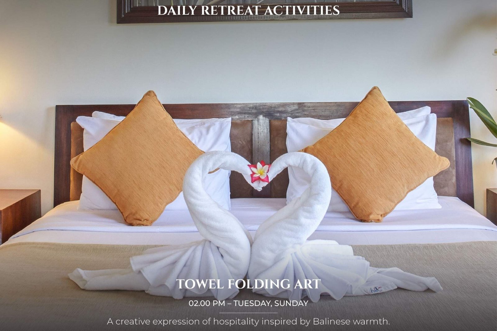 It is our pleasure to share a part of Balinese Hinduism culture with you by introducing you to the daily custom of preparing simple offering. After making “Canang”, you may take your offering to the hotel temple accompanied by Balinese staff.